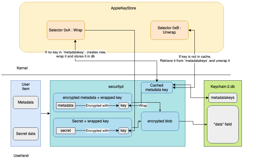 In this article, we will details what happens when an item is added in the keychain, and how this items is stored in database. It will not cover all the details on how the access control is done as it is another big subject for another article.