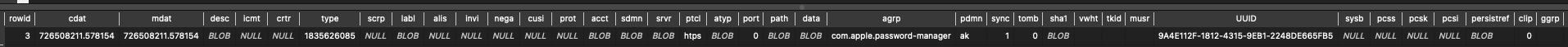 The database contains, among others thing, tables corresponding for each item classes. genp table for kSecClassGenericPassword, inet table for kSecClassInternetPassword etc…